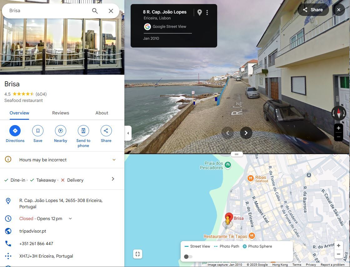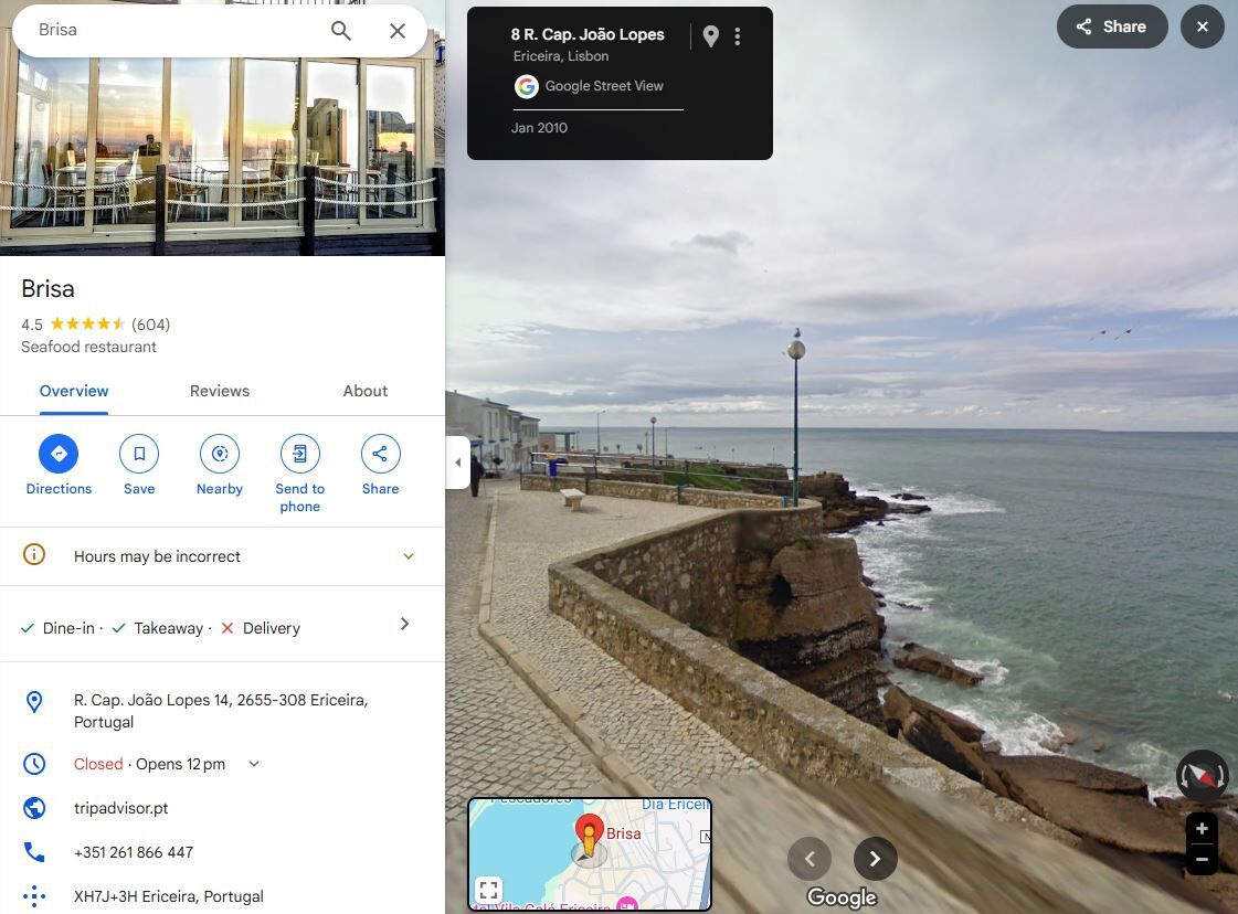 住所 (Outside Restaurant Brisa)R. Cap. João Lopes 14, 2655-290 Ericeira, Portugal