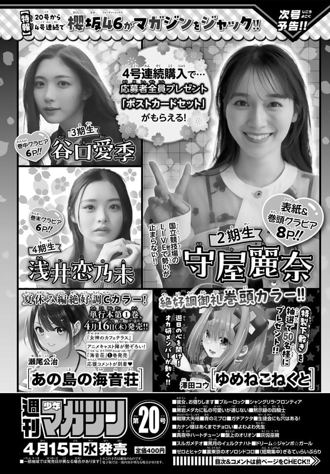 来週4月15日(水)発売の「週刊少年マガジン 2026年 No.20」の表紙&巻頭グラビアは櫻坂46 守屋麗奈さん、巻中グラビアは谷口愛季さん、巻末グラビアは浅井恋乃未さんです。 表紙が公開され次第、改めてお知らせします …